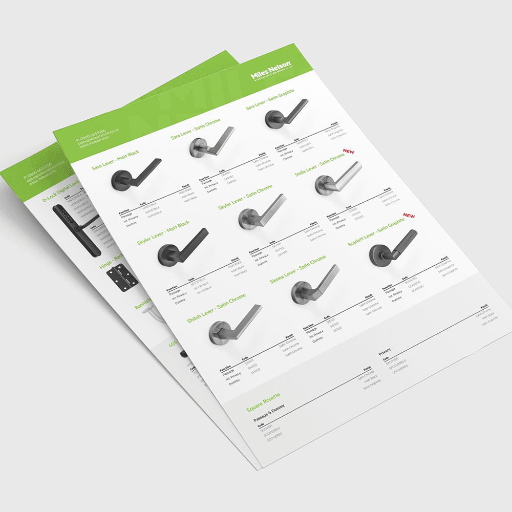 Catalogues 2025 Miles Nelson Residential CatalogueExplore the residential 2025 collection of door hardware and accessories from Miles Nelson.View Document 2025 Miles Nelson Commercial HardwareDiscover the comprehensive Miles Nelson 2025 range of commercial door hardware and accessories.View Document SchlegelGiesse Product CatalogueBrowse the 2023 - 2024 edition of Schlegel Giesse sealing & hardware solutions catalogue.View Document Brochures Miles Nelson Milano Houselot FlyerExplore the 2024 Milano Range Houselot flyer for the latest hardware and accessories.View Document Miles Nelson S-Range Houselot FlyerCheck out the newest 2024 S-Range Houselot flyer and discover fresh styles and the latest trends.View Document LED Ready Bannister BracketsOur latest addition to the Bannister Bracket range. LED ready, hollow Bannister Brackets.View Document MNC Salto Retrofit FlyerSave installation time on your Salto retrofit with MNC products that have been designed specifically for the Salto digital locks.View Document MNC Latest Additions Flyer - 2025Check out our latest MNC product additions for 2025! Including the Selim hinge, KO lever and dual lock egress furniture.View Document Selim Hinge Flyer - 2025Check out our brand new high performance hinges for aluminium and timber doors. The Selim hinge.View Document Flowmate – Smart Downpipe Protection flyerSmart, drop-in insert that prevents blocked downpipes. Fits Marley gutters. View the flyer for specs, sizing, and install steps.View Document Approved Fire Rated Hardware - 2025View our 2025 Approved Fire Rated Hardware List. A comprehensive table of fire door brands and hardware.View Document Pro-Series Matt Black Knobsets FlyerCheck out our brand newest additions to the Pro-Series range. Matt Black Knobsets.View Document