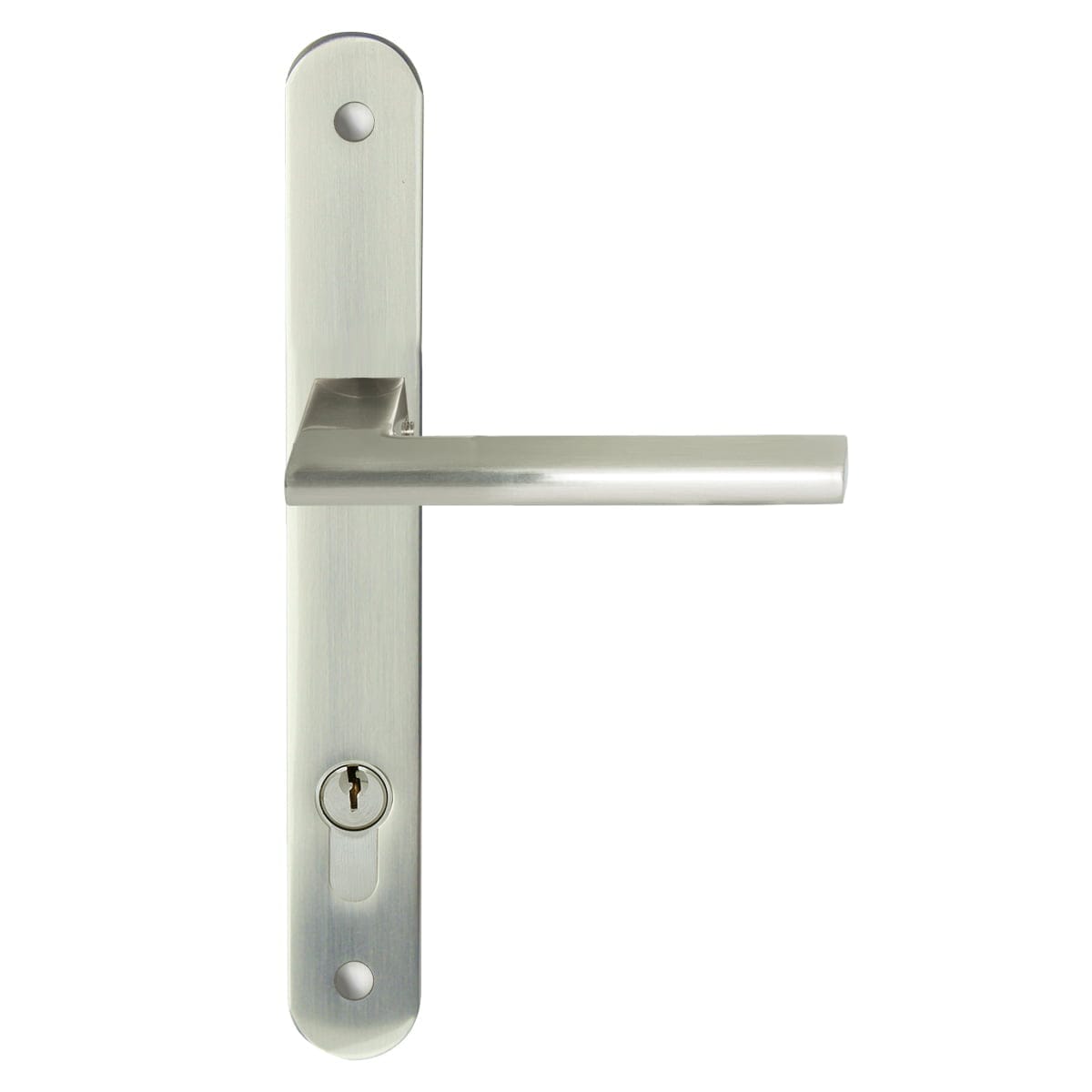 This Forli Round Long Plate handle set in Satin Nickel is ideal for external doors. And includes a euro mortice lock with keyed lock on the outside and turn on the inside. All Milano lever styles in Satin Nickel finish are available in a long plate option in round or square edge matching the round or square rosette of the handle, creating a consistant look throughout your home.