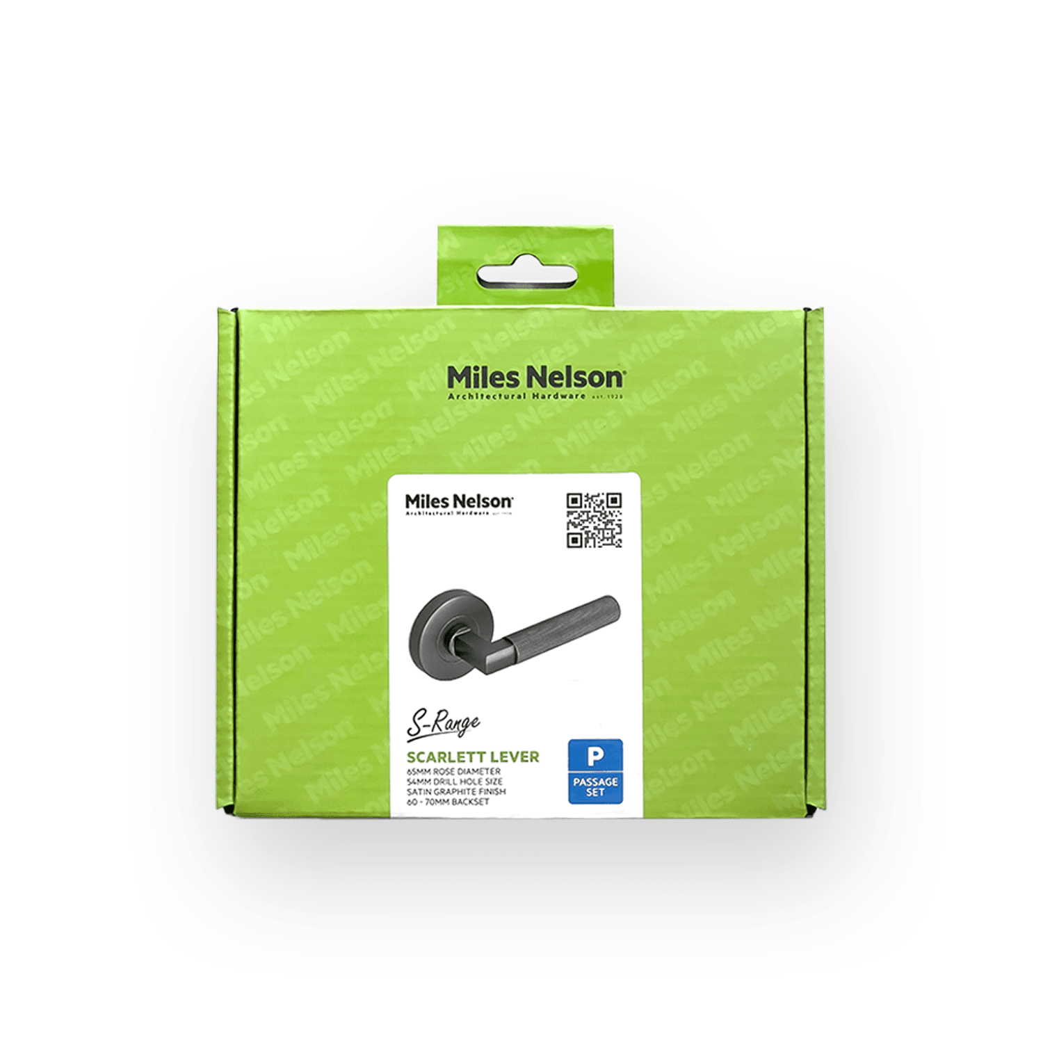 This Scarlett Lever Passage Set in Satin Graphite finish is part of the S-Range lever handle collection. All S-Range handles are supplied with a round rosette. Square rosette covers are available separately (SCOVER).